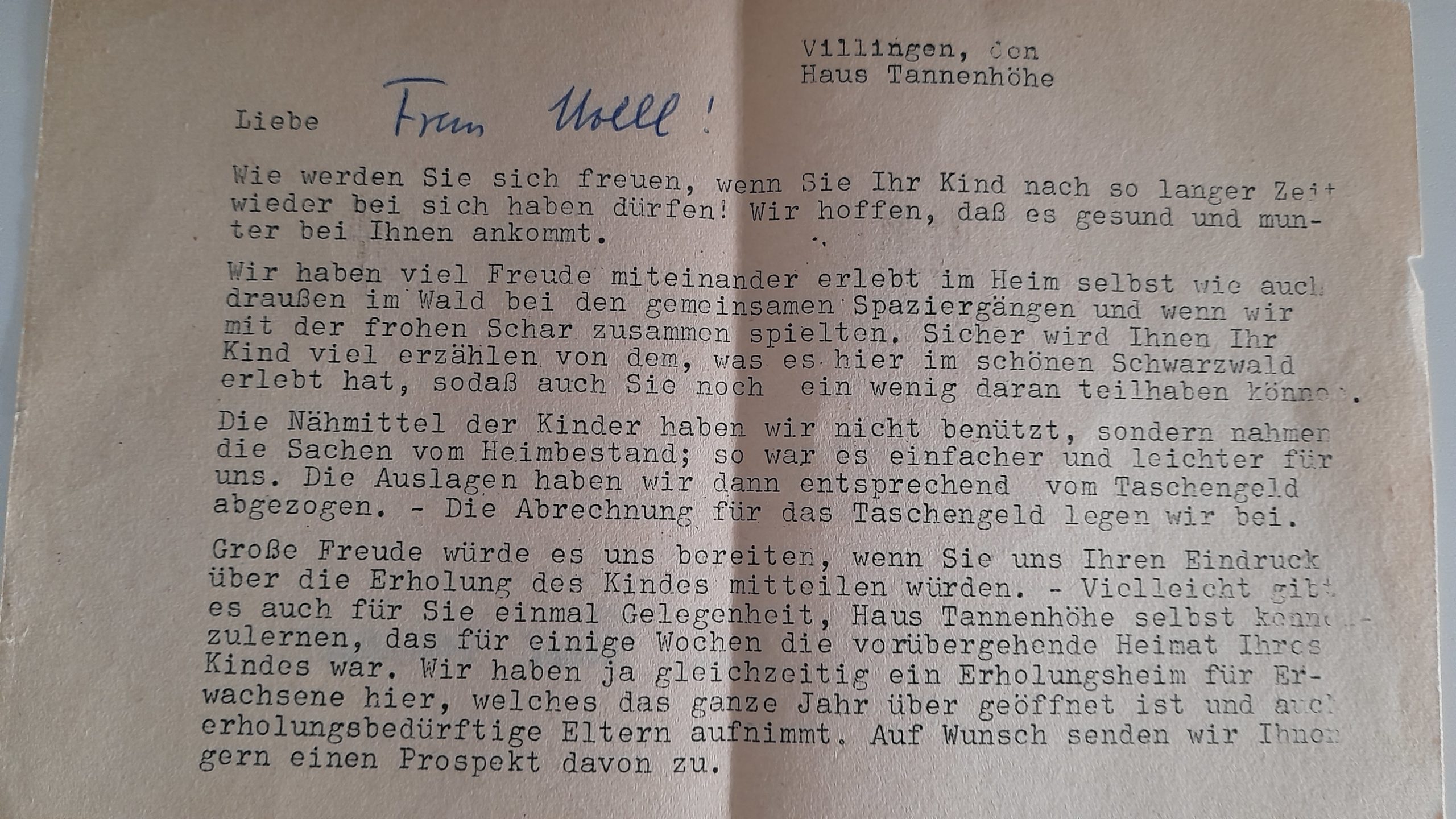 Foto des Kinderheimes Tannenhöhe in Villingen-Schwennigen und Briefe an die Mutter
